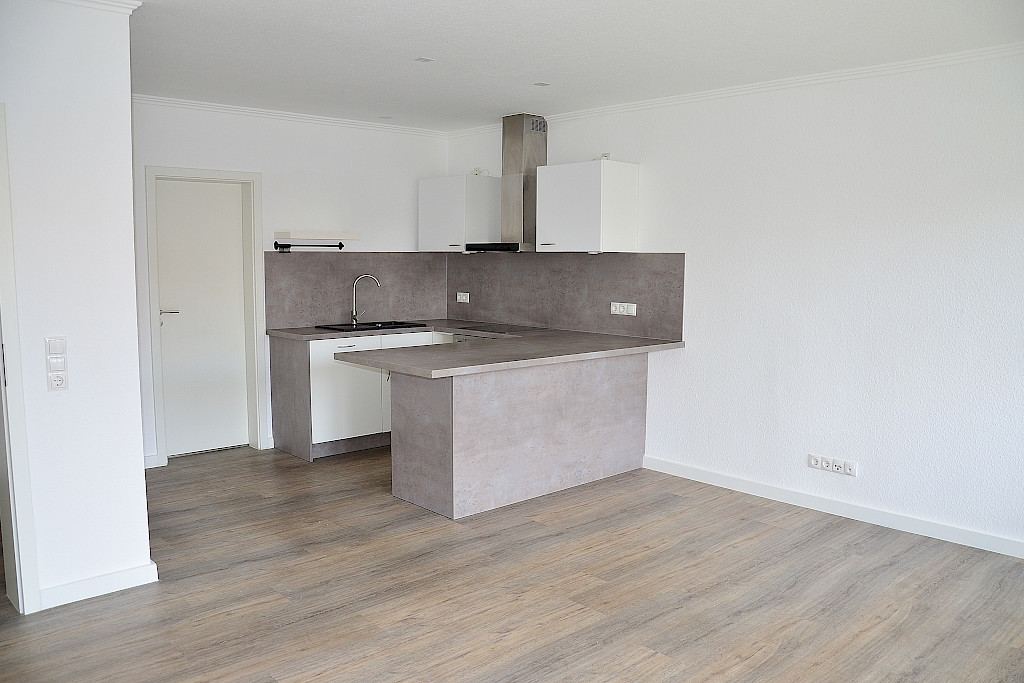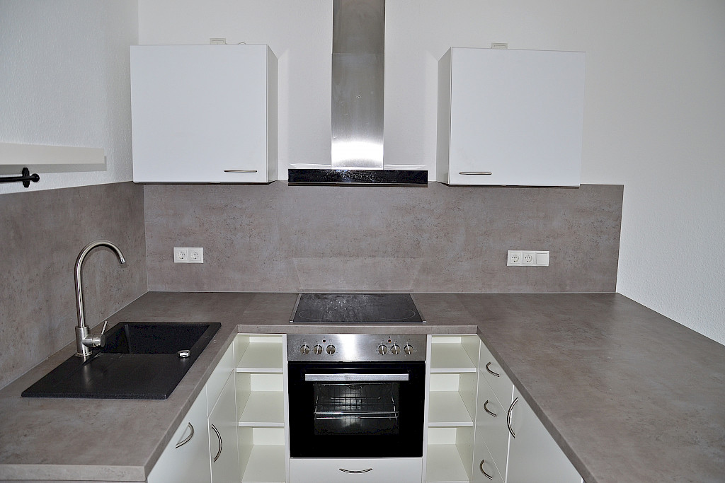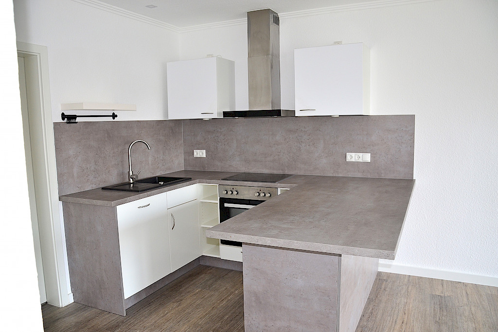 - neu gestalteter Kochbereich ausgestattet mit erstklassiger Einbauküche mit grauen Fronten sowie hellgrauer Arbeitsplatte