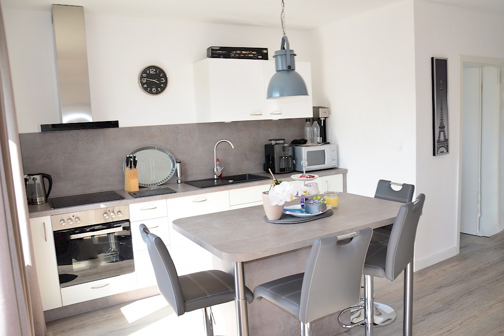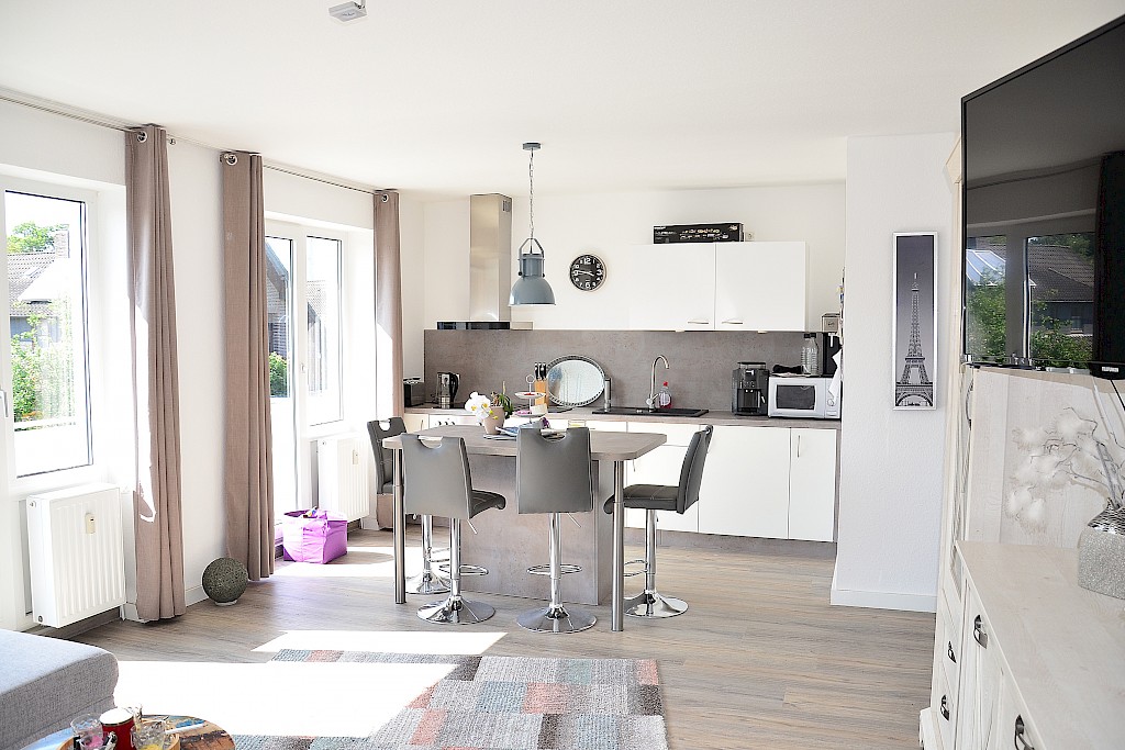 - neu gestalteter Kochbereich ausgestattet mit erstklassiger Einbauküche mit grauen Fronten sowie hellgrauer Arbeitsplatte und Arbeitsinsel