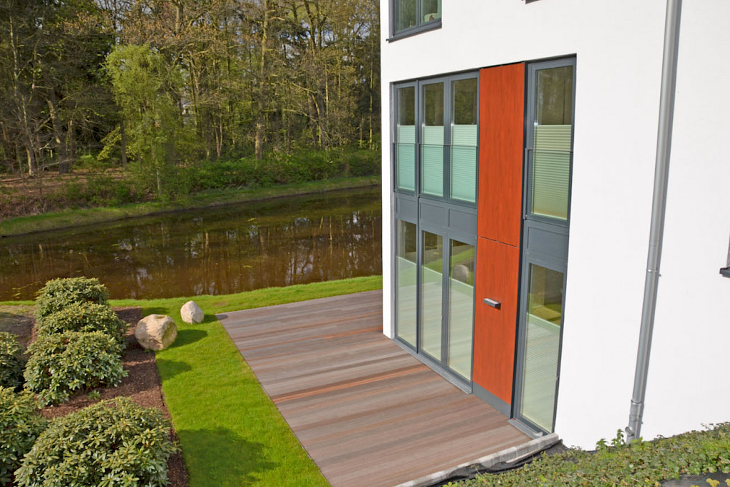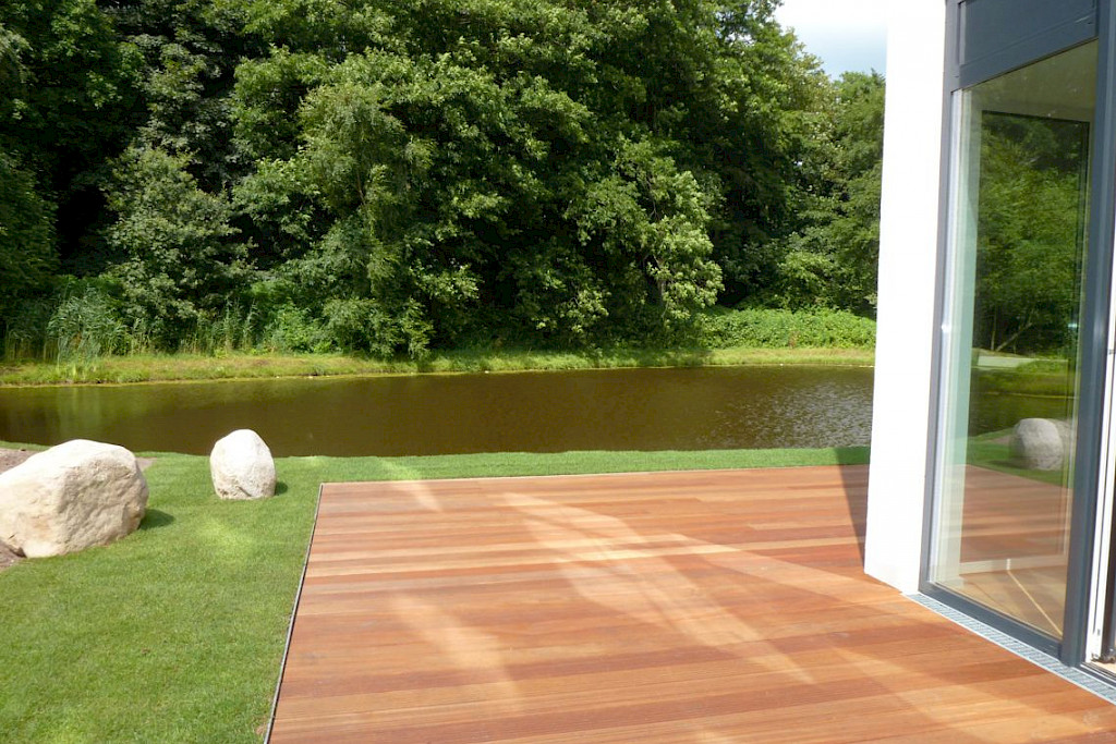 - die XXL-Loungeterrasse am See ist mit hochwertigem wetterfesten Bankirai- Terrassendielen auf geeignetem Unterbau versehen