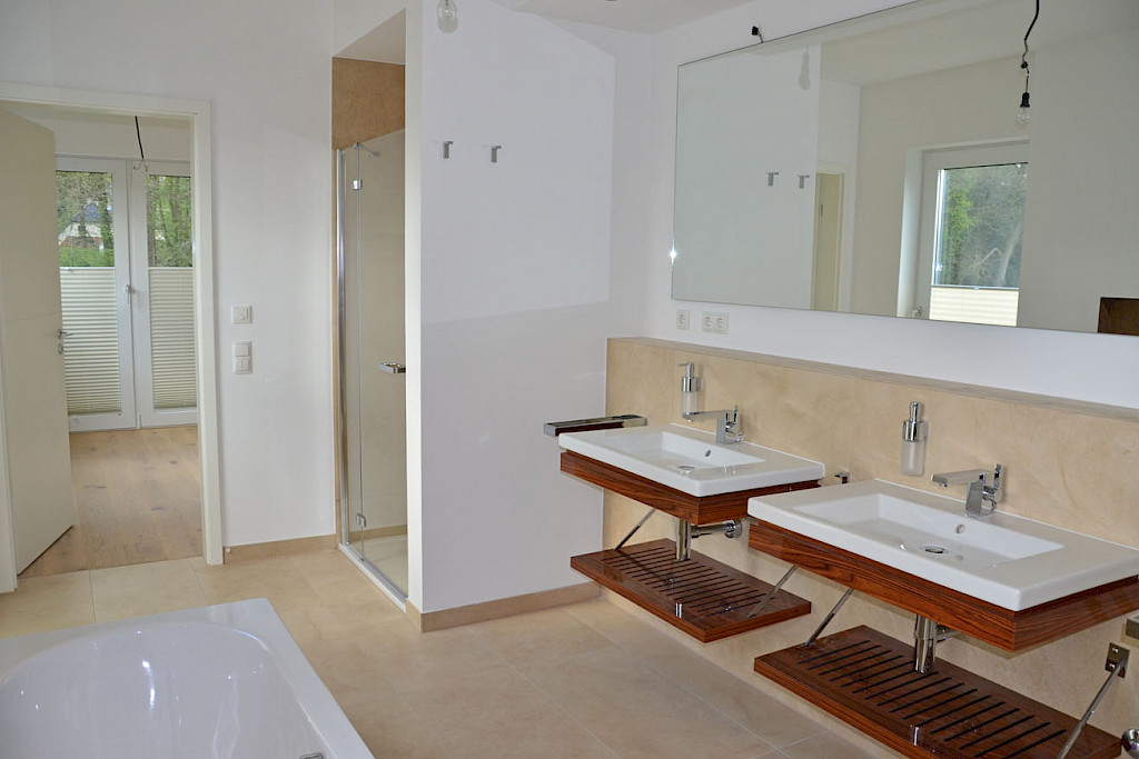 - Ausstattung der Badbereiche: mit edlen Sanitärobjekten aus hochwertiger Keramik der Firma DURAVIT, die Waschtische sind mit einer Waschtischblende aus Echtholzfurnier in der Farbe Palisander (Fabrikat DURAVIT, Serie „2nd floor“) ausgestattet. Passend aus der Serie „2nd floor“ sind Waschtischroste für die Ablage von Handtüchern sowie je ein beleuchteter Spiegel hinzugekommen.