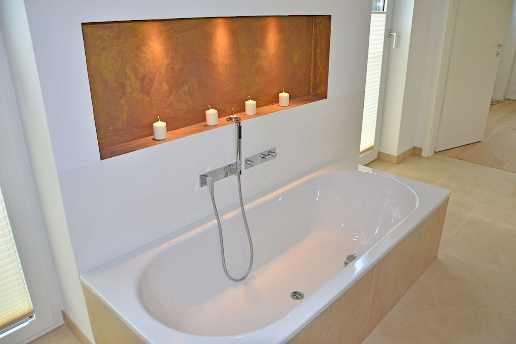 - Die Badewannenanlage besteht aus einer hochwertigen Einbaubadewanne aus Stahl der Firma „Bette“. Die verchromte Ab- und Überlaufgarnitur sowie die exklusive Schlauchbrausegarnitur mit Abdeckplatte stammen passend aus der Serie „Symetrics“ der Firma DORNBRACHT