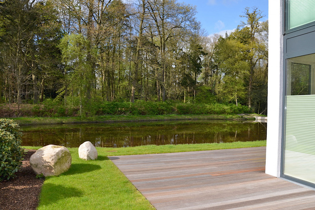Außergewöhnliche Seegeschoss Wohnung über 2 Etagen mit Fahrstuhl direkt an einem kleinen See mit großer Lounge-Terrasse sowie mit modernster Technik, stilvoller Einbauküche + 2 Tiefgaragen-Stellplätzen im Zentrum von Rastede