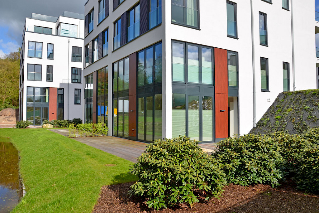 - die Gestaltung der Grün- und Freianlagen erfolgte durch einen Landschaftsarchitekten gem. Außenanlagenplanung. Die Freiflächen zwischen den Häusern wurden als Parklandschaft überwiegend mit Rasenflächen, unterbrochen von Heckenpflanzen, gestaltet