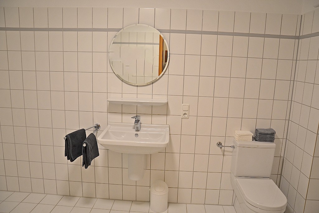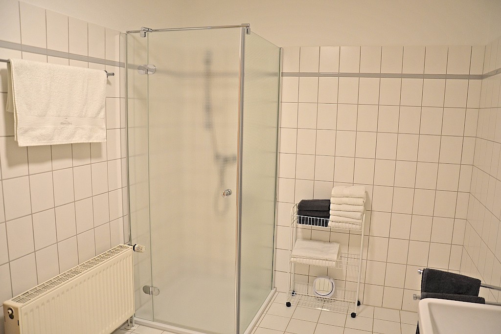 - Badbereich türhoch weiss gefliest mit umlaufender hellgrauer Bordüre, ausgestattet mit weißen Bodenfliesen, Waschtisch, einstiegsfreundliche Dusche mit Duschabtrennung und WC, Sanitärobjekte in weiss