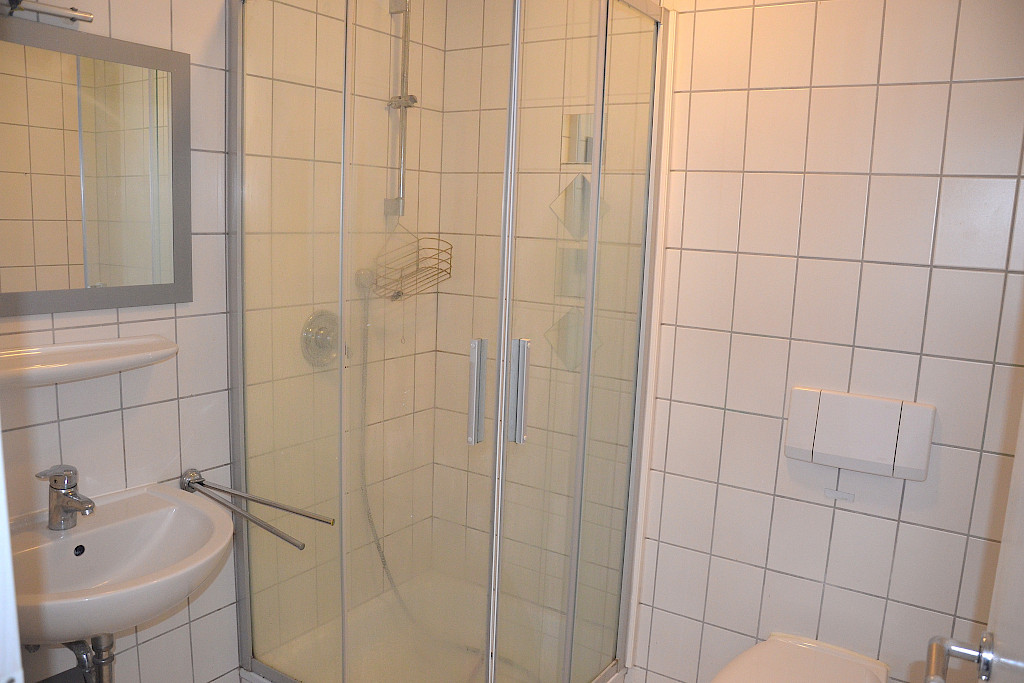 - Badbereich deckenhoch gefliest mit einer weißen Fliese, ausgestattet mit einer weißen Bodenfliesen, Waschtisch, Dusche mit neuer Duschabtrennung und wandhängendem WC, Sanitärobjekte in weiss