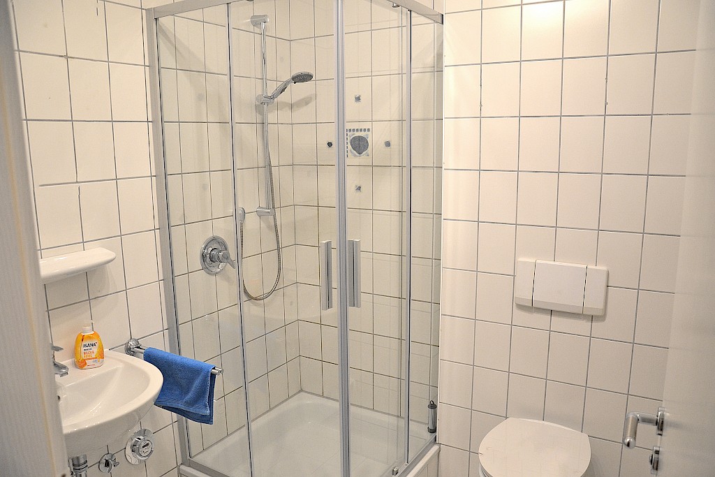 • Badbereich deckenhoch gefliest mit einer weißen Fliese, ausgestattet mit einer weißen Bodenfliesen, Waschtisch, Dusche mit Duschabtrennung und wandhängendem WC, Sanitärobjekte in weiss
