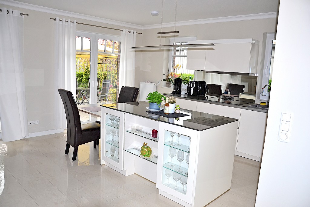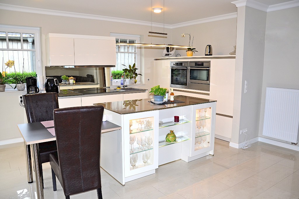 - stilvolle Einbauküche mit hellen Hochglanz- Fronten und dunkler Granit- Arbeitsplatte sowie modernen Elektrogeräten