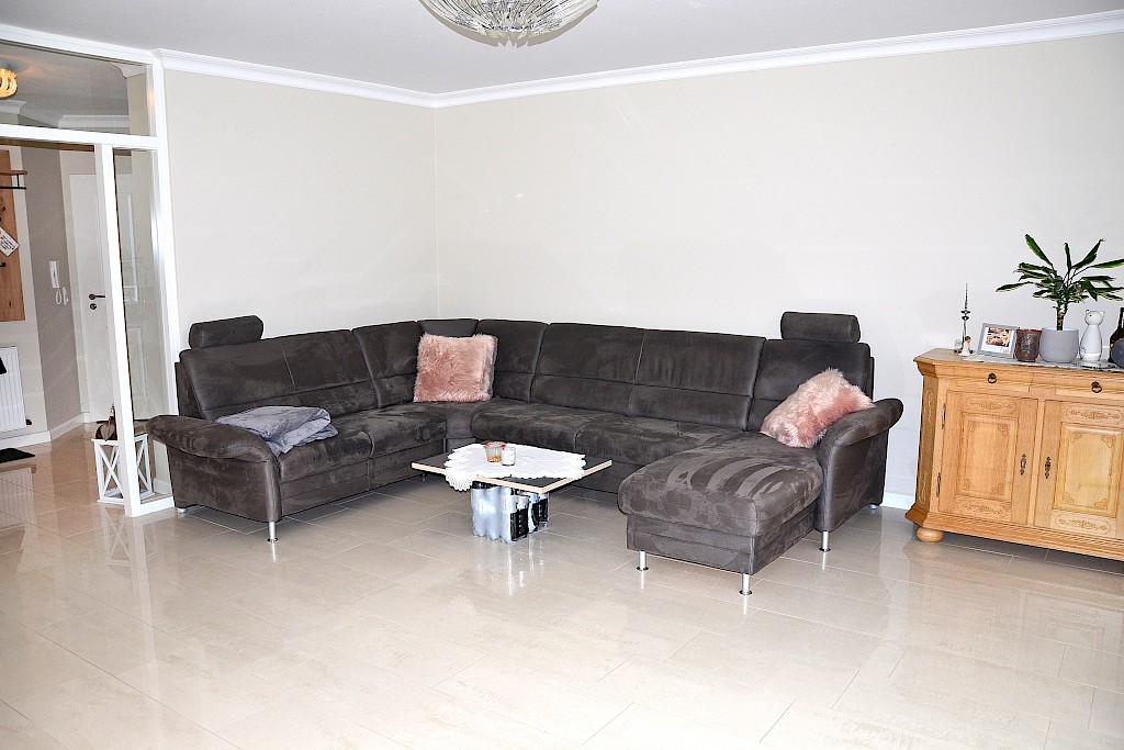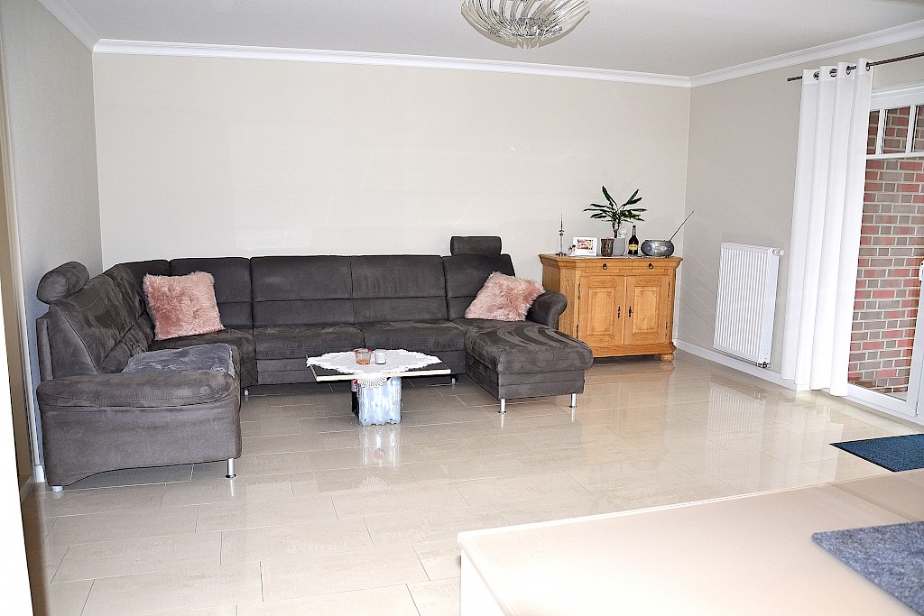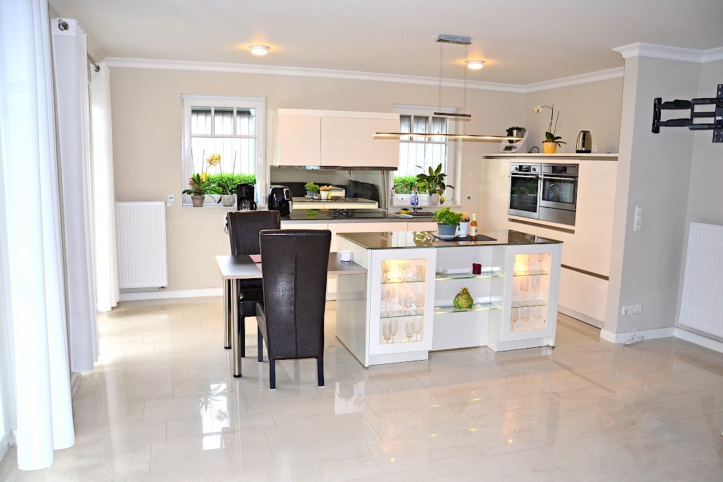 - Fußböden im Wohn-, Ess- und Kochbereich, im Gäste-WC, im Abstellraum/ Heizungsraum sowie in der Eingangsdiele mit einer aparten hellen Hochglanz- Fliese gestaltet