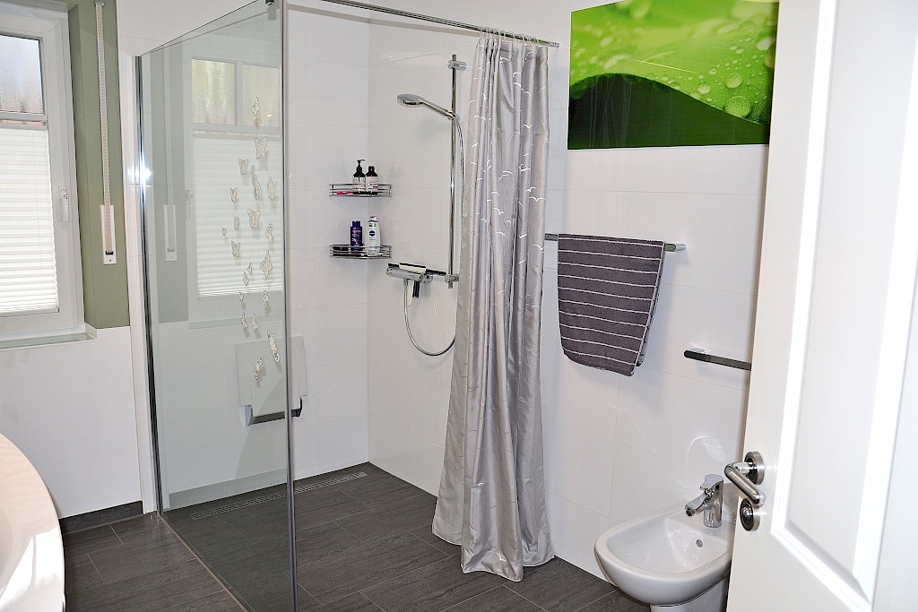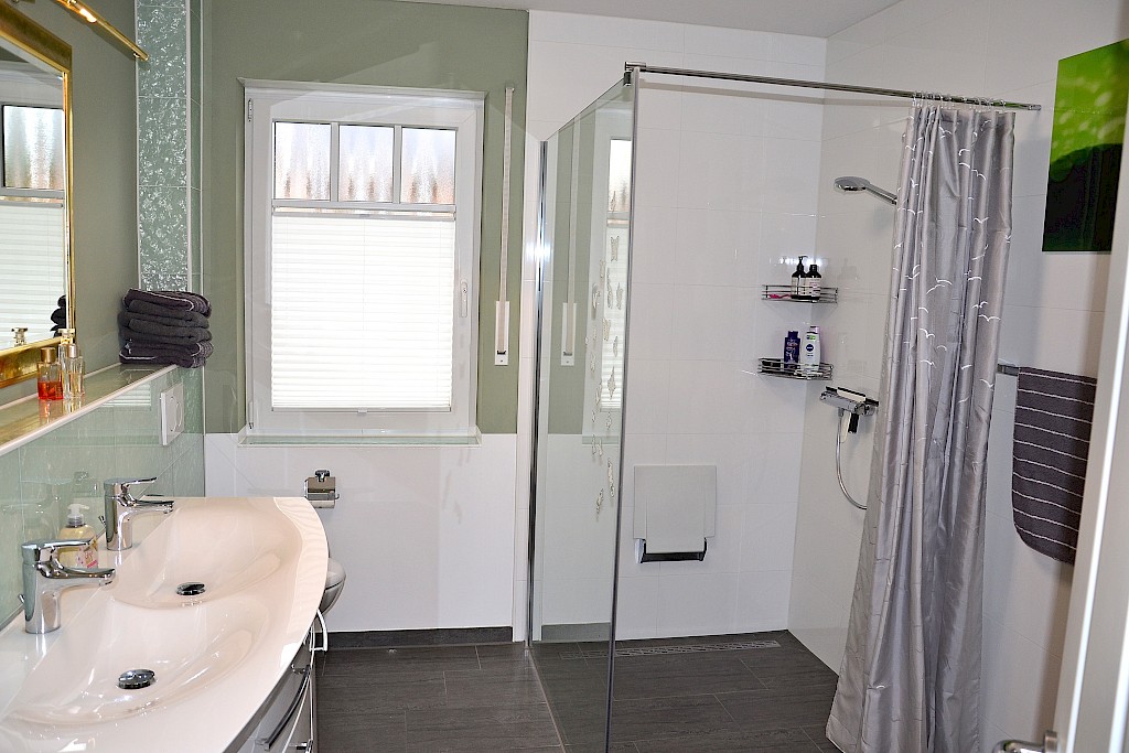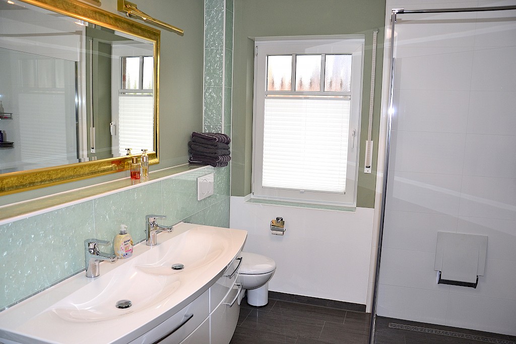 - Badbereich mit anthrazitfarbenen Bodenfliese sowie einer weißen Hochglanz-Fliese gestaltet, ausgestattet mit begehbarer Dusche mit Echtglas- Duschwand, Doppel- Waschtisch mit Unterschrank sowie wandhängendes WC, Sanitärobjekte in weiss