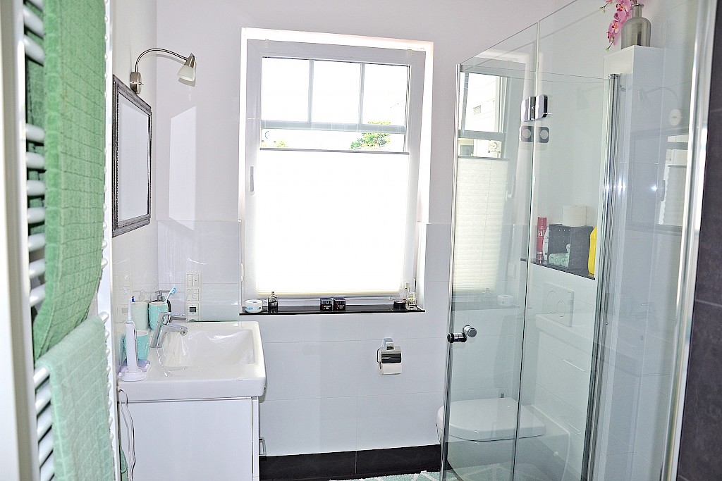 - der Badbereich ist mit einer anthrazitfarbenen Hochglanz- Bodenfliese mit passenden Mosaikfliesen im Duschbereich sowie mit einer weißen Hochglanz- Wandfliese gestaltet