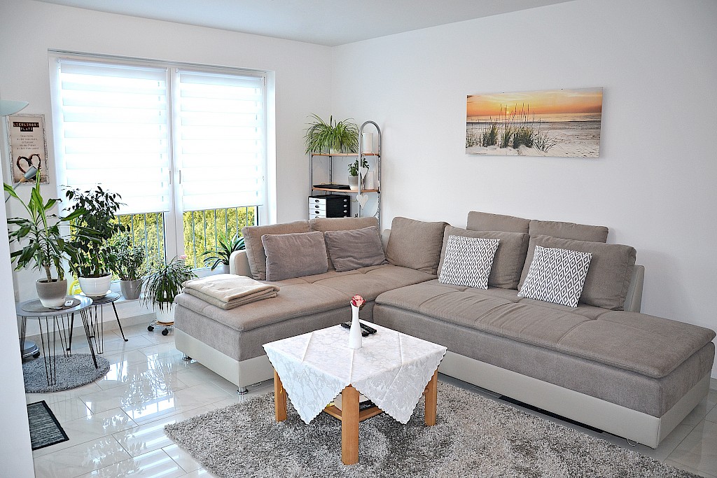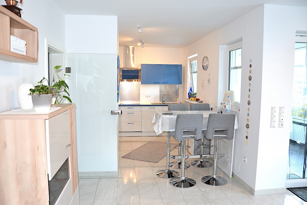 - Die gesamte Wohnung ist mit einem einheitlichen hochwertigen Hochglanz- Fliesenboden in weißer Marmoroptik gestaltet
