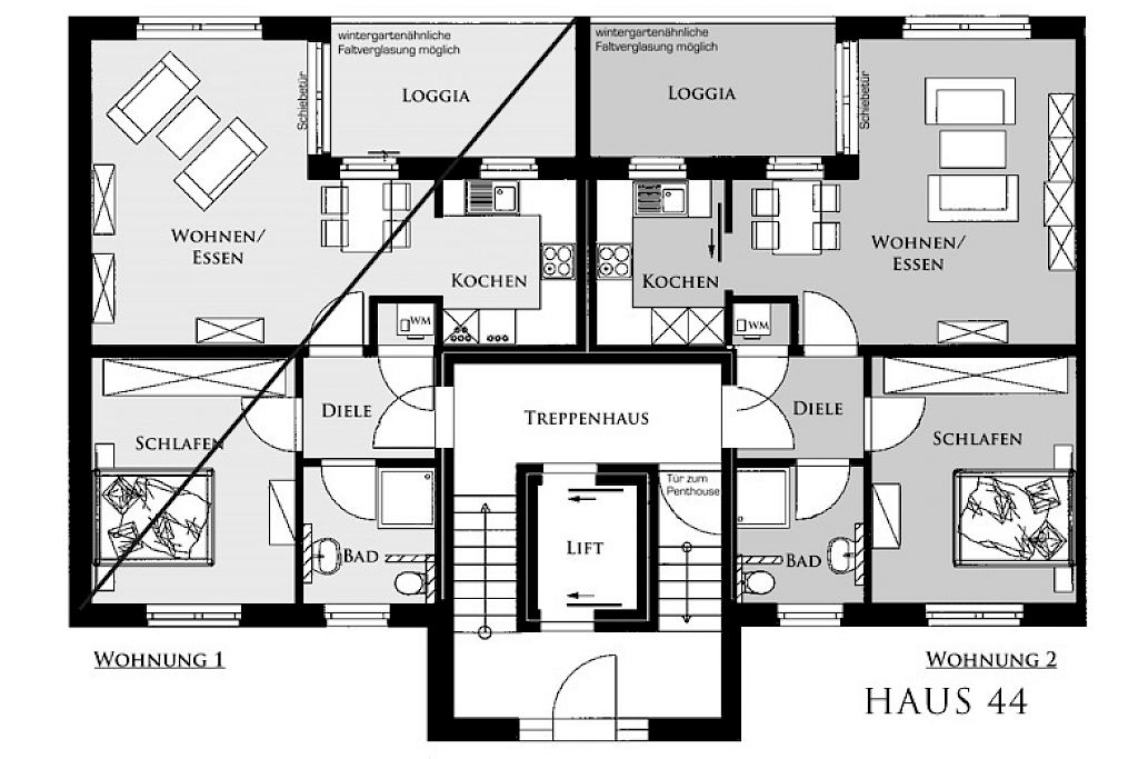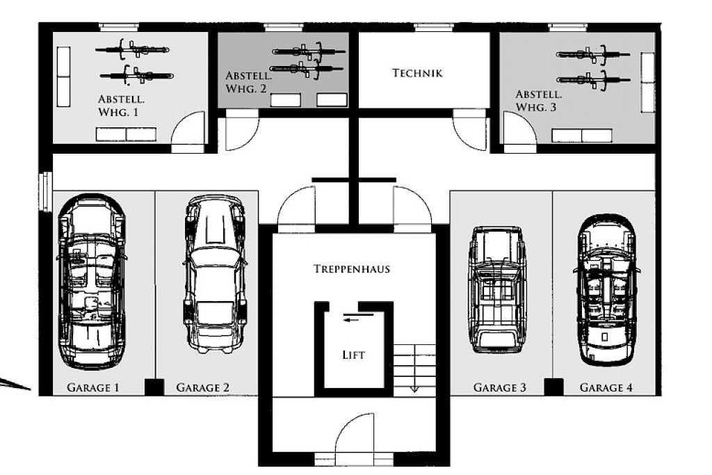 - jedes Treppenhaus ist mit einem elektrobetriebenen Personenaufzug von den Garagen bis in jede Etage versehen