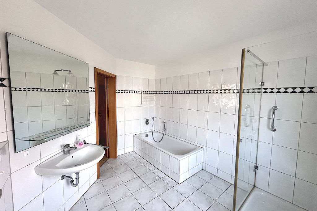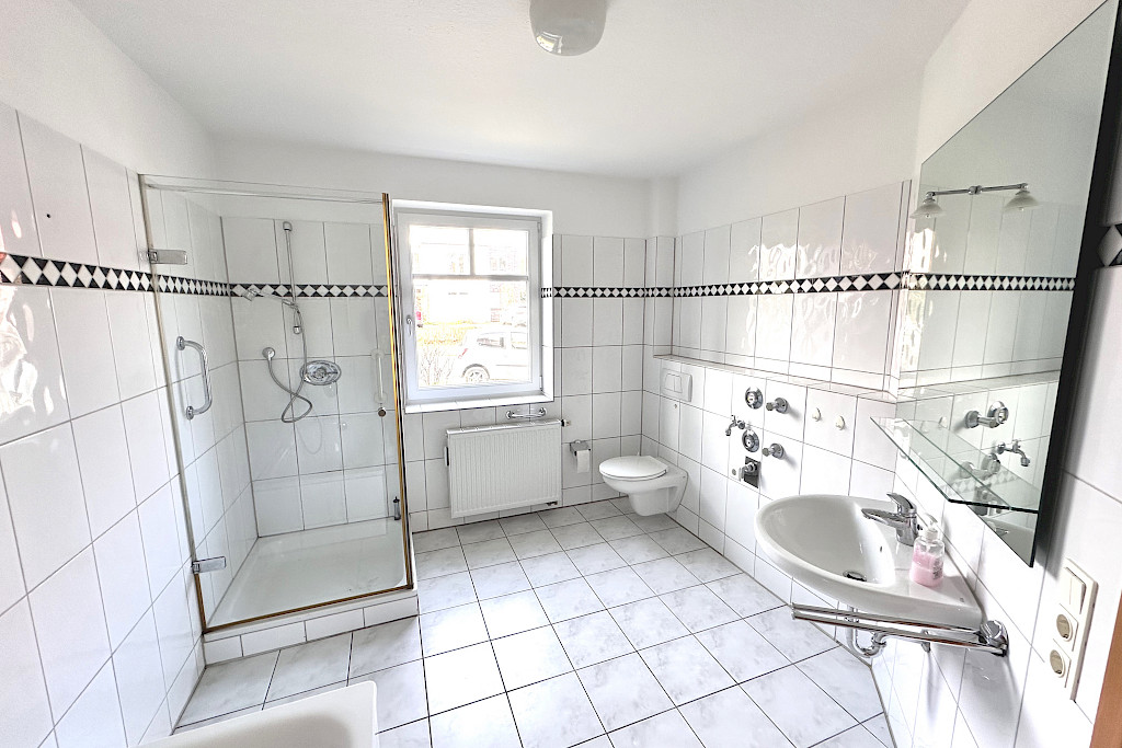 - Badbereich türhoch weiss gefliest mit umlaufender Bordüre, ausgestattet mit weißen Wand- und Bodenfliesen, zwei Waschtischen, einstiegsfreundliche Dusche mit Duschabtrennung, Badewanne und WC, Sanitärobjekte in weiss