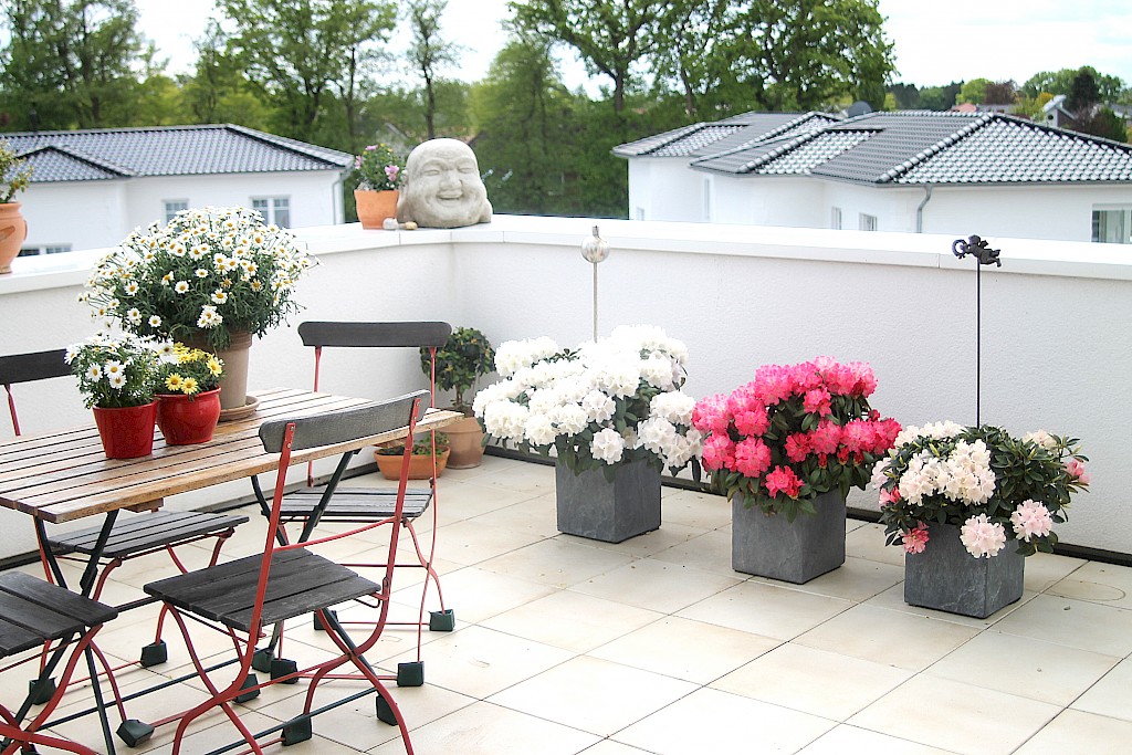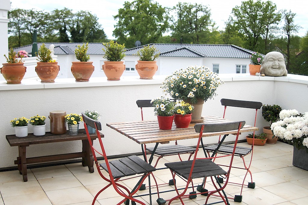 - geschützt liegende, teilüberdachte Dachterrasse in optimaler Süd-/ Südwestausrichtung mit hochwertigen hellen Terrassenplatten