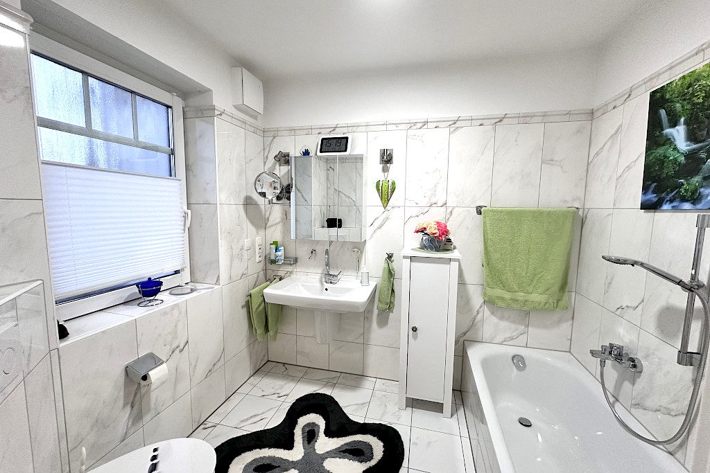 - das Masterbad en suite ist türhoch gefliest mit einer weißen Wandfliese in Marmoroptik und ausgestattet mit einer Badewanne, Waschtisch sowie wandhängendem WC, Sanitärobjekte in weiß