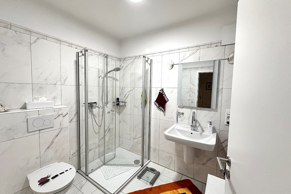 - der zweite Badbereich ist ebenfalls türhoch gefliest mit einer weißen Wandfliese in Marmoroptik und ausgestattet mit einer Duschtasse als Flachschale mit Echtglasduschabtrennung, Waschtisch und wandhängendem WC; Sanitärobjekte in weiss