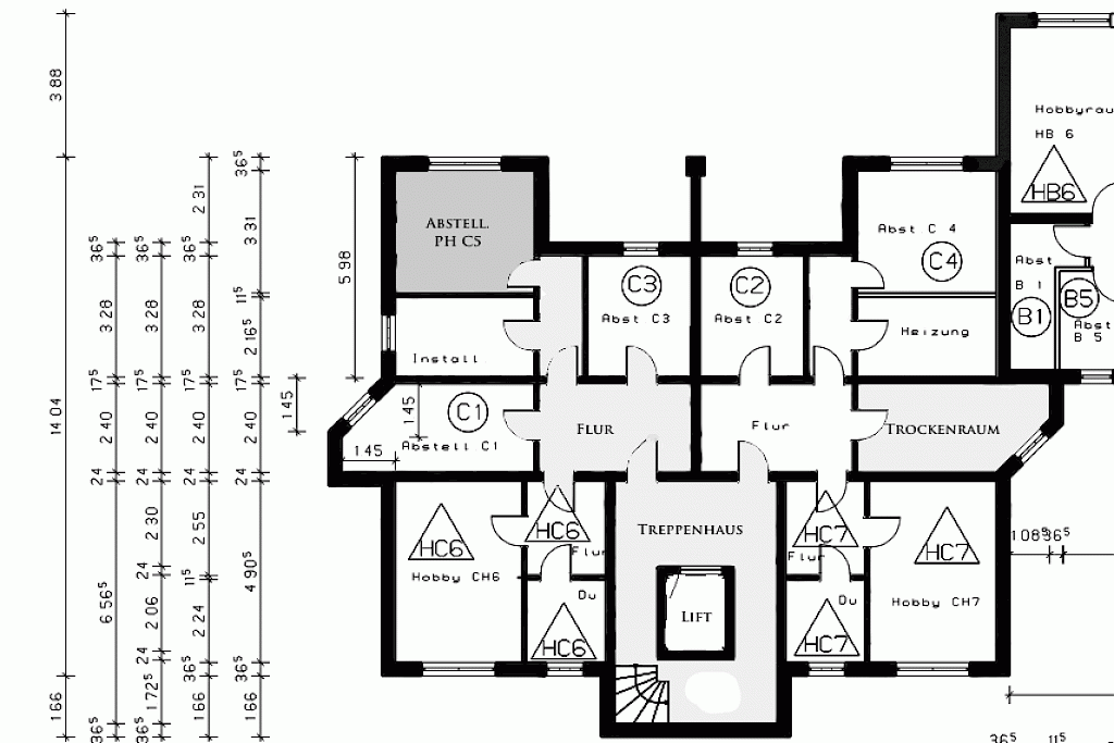- der Hochkellerbereich mit dem separaten Abstellraum Nr. C5 für die Wohnung, Heizungsraum, Installationsraum sowie Trockenraum