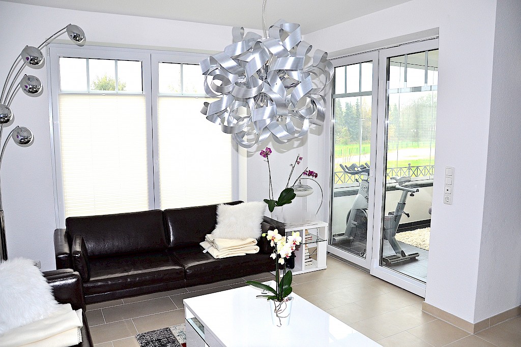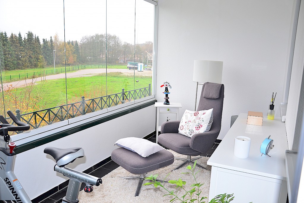 • die Südloggia ist mit einer rahmenlosen Faltverglasung versehen- so ist ein geschützter, wintergartenähnlicher Platz entstanden. Bei gutem Wetter kann die Loggia selbstverständlich als offener Bereich genutzt werden